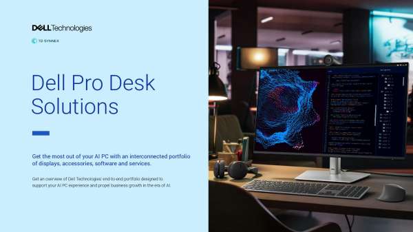 Strengthen every AI PC investment. The "Dell Pro Desk Solutions" brochure shows how you can: - Integrate displays, docks, and accessories for seamless workflows - Manage PCs remotely with the Dell Pro Thunderbolt 4 Smart Dock - Align software and services to simplify lifecycle management To get a smarter, fully connected desk strategy, download the brochure.